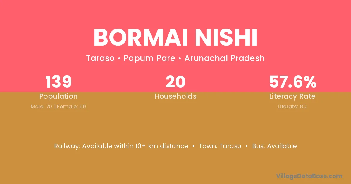 Bormai Nishi village has a total population of 139 people, of which 70 are males and 69 are females.