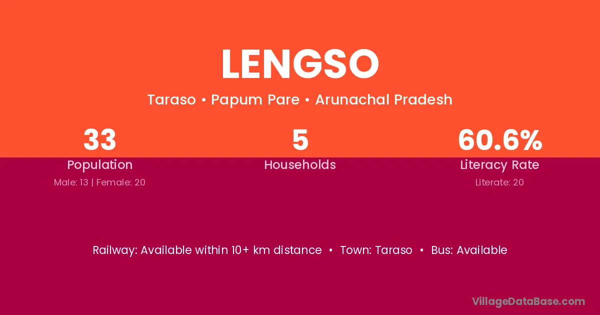 Lengso village has a total population of 33 people, of which 13 are males and 20 are females.