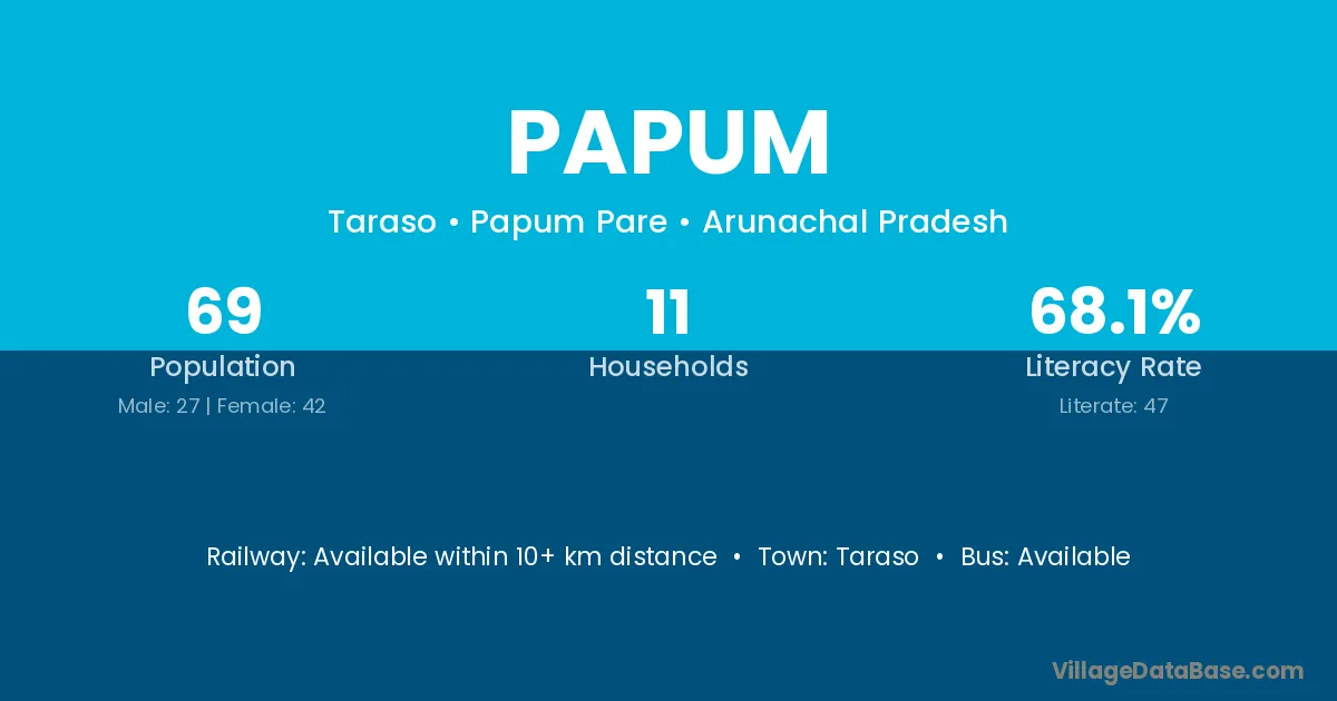 Papum village has a total population of 69 people, of which 27 are males and 42 are females.