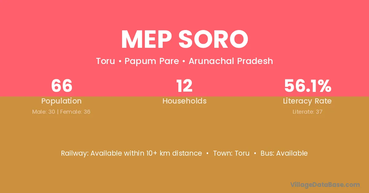 The literacy rate of Mep Soro village is 56.06%. Male literacy stands at 60.00% and female literacy at 52.78%.