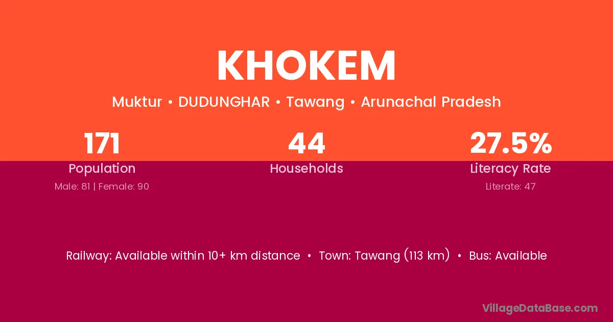 Tawang (113 km) is the nearest town to Khokem village for major economic activities and is located approximately 113 km away.