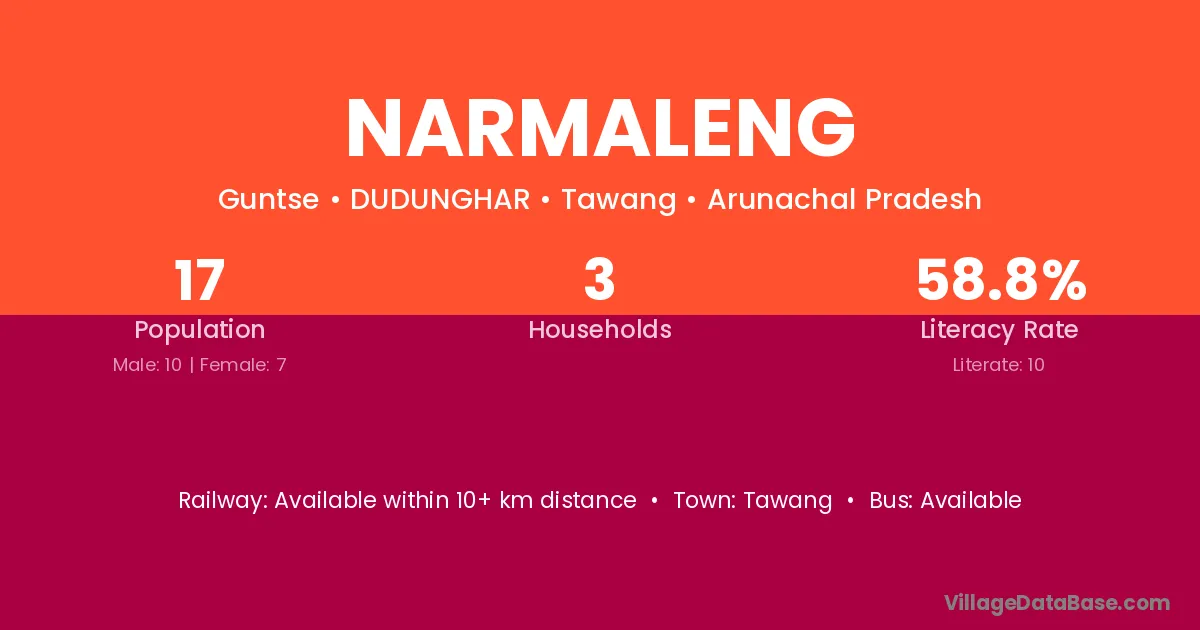 Narmaleng village has a total population of 17 people, of which 10 are males and 7 are females.