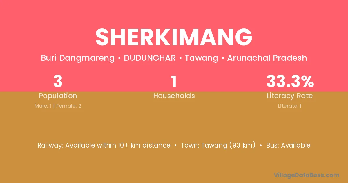 Sherkimang village has a total population of 3 people, of which 1 are males and 2 are females.