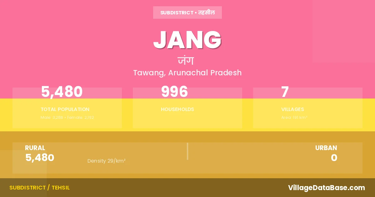 Jang is a town and Circle in the Tawang district of the Arunachal Pradesh. In India, a Circle is a subdivision of a district responsible for the administration and revenue collection of a specific area within the district. Circles play a crucial role in the local governance structure, contributing significantly to the development and administration of their communities.