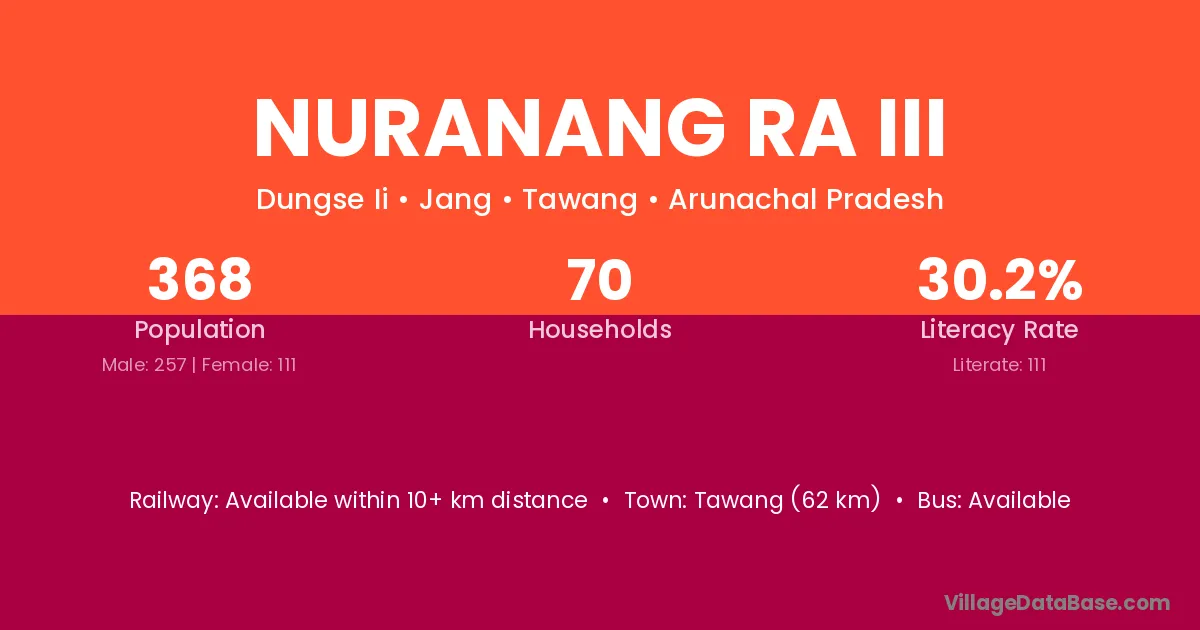 Nuranang Ra Iii village has a total population of 368 people, of which 257 are males and 111 are females.