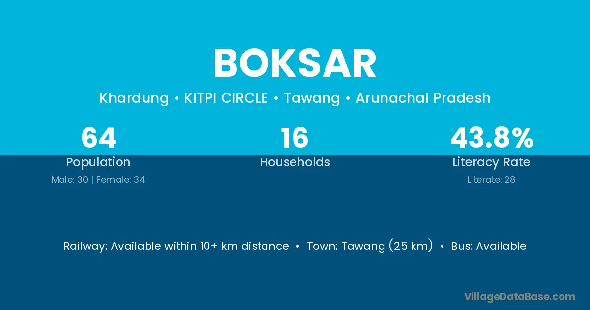 Tawang (25 km) is the nearest town to Boksar village for major economic activities and is located approximately 25 km away.