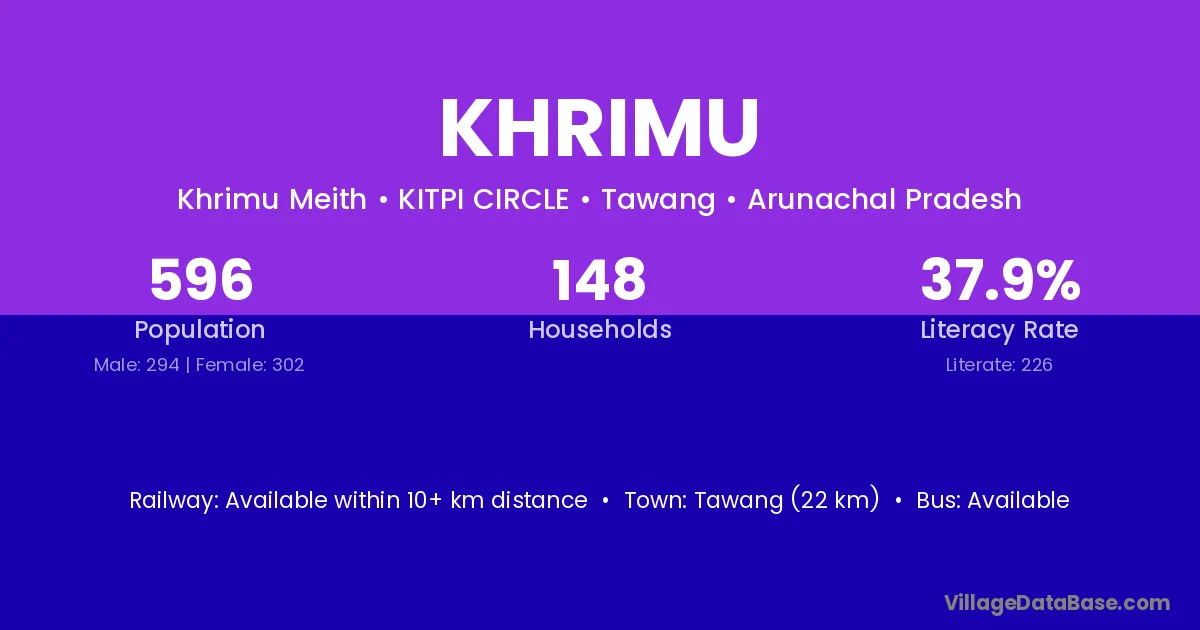 Khrimu village has a total population of 596 people, of which 294 are males and 302 are females.