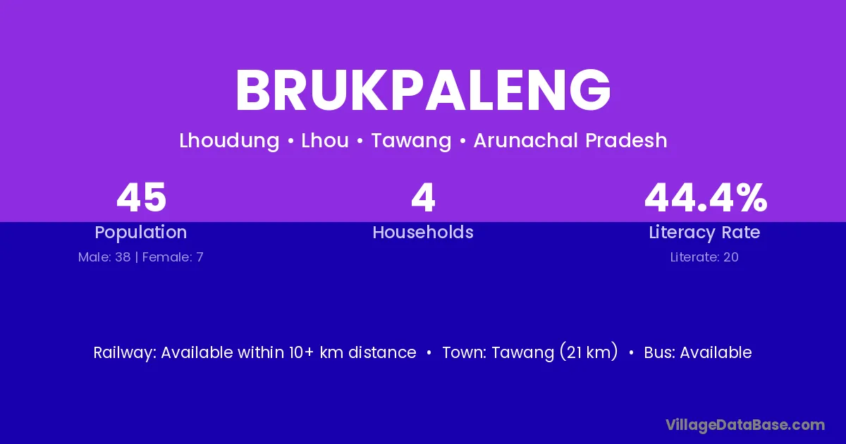 Tawang (21 km) is the nearest town to Brukpaleng village for major economic activities and is located approximately 21 km away.