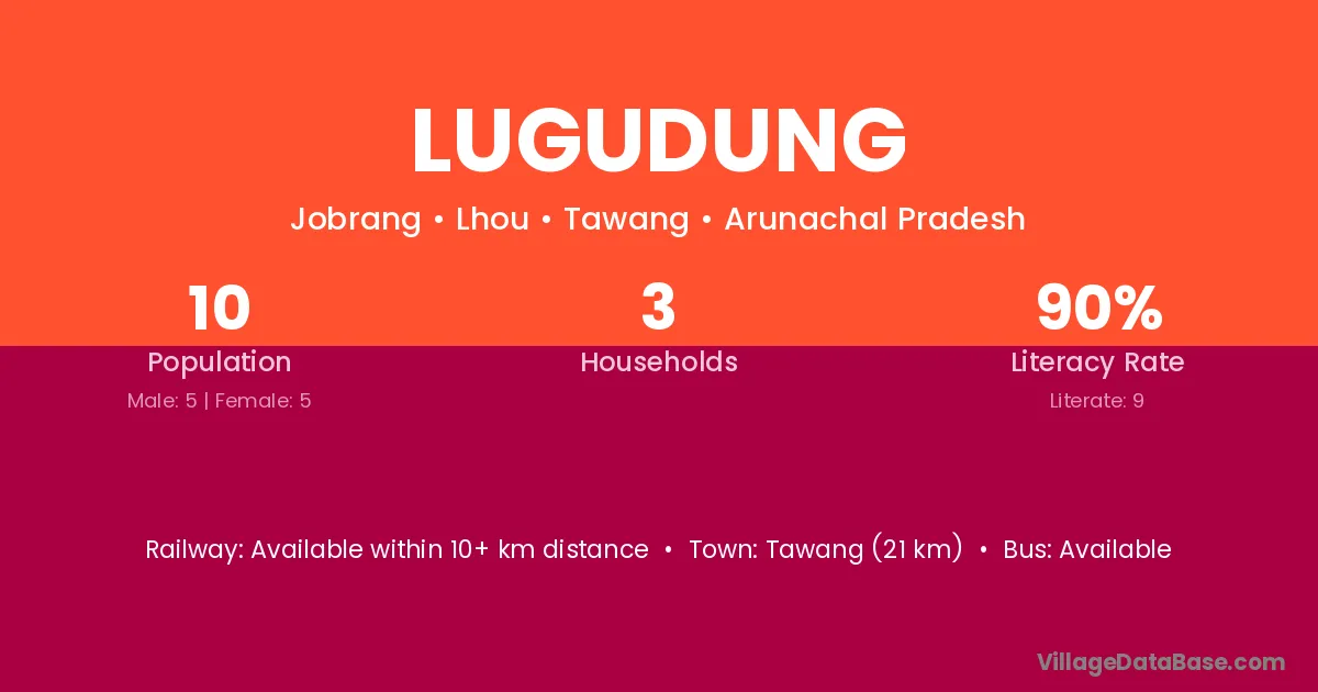 Tawang (21 km) is the nearest town to Lugudung village for major economic activities and is located approximately 21 km away.