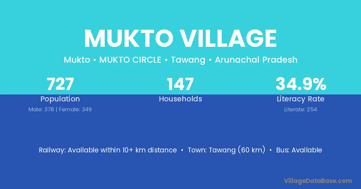Tawang (60 km) is the nearest town to Mukto Village village for major economic activities and is located approximately 60 km away.