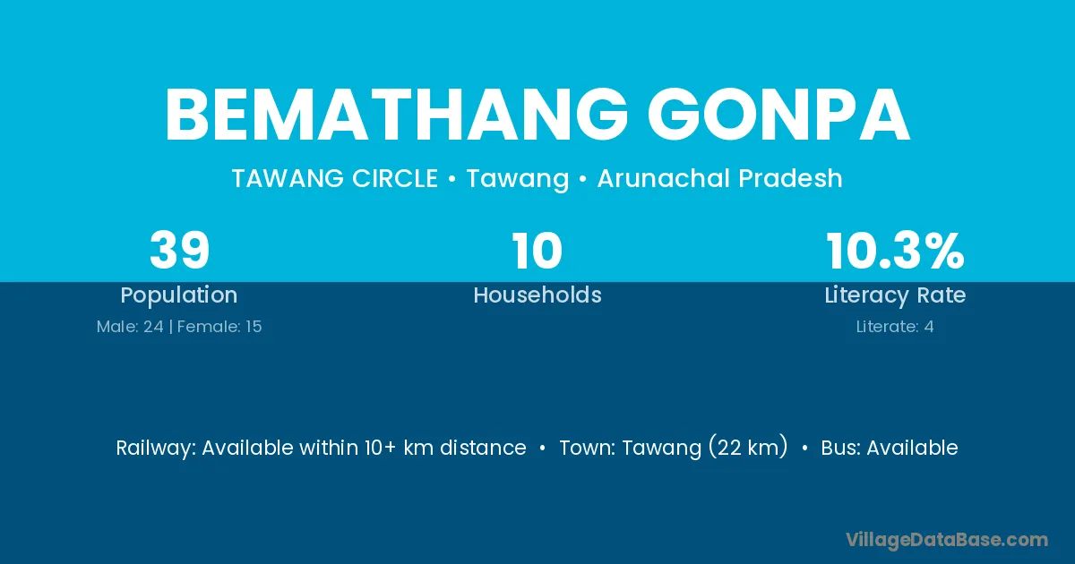 Tawang (22 km) is the nearest town to Bemathang Gonpa village for major economic activities and is located approximately 22 km away.