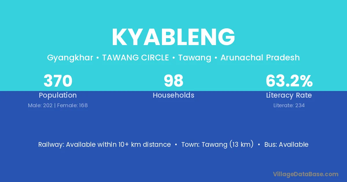 Tawang (13 km) is the nearest town to Kyableng village for major economic activities and is located approximately 13 km away.