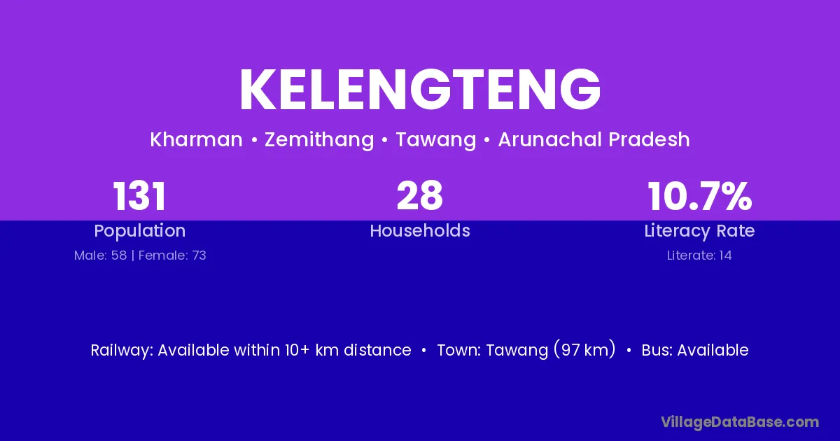 Tawang (97 km) is the nearest town to Kelengteng village for major economic activities and is located approximately 97 km away.