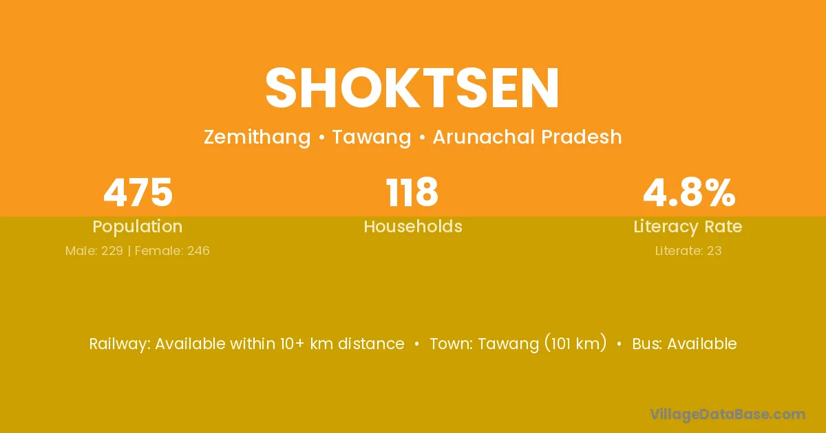 Shoktsen village has a total population of 475 people, of which 229 are males and 246 are females.