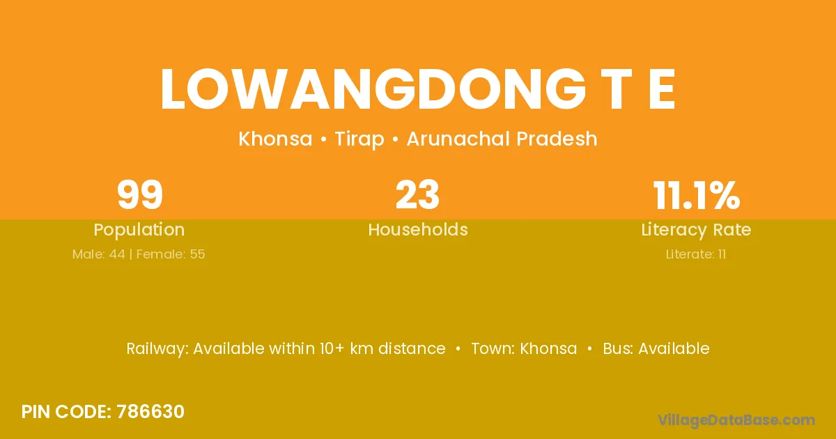 Lowangdong T E village has a total population of 99 people, of which 44 are males and 55 are females.