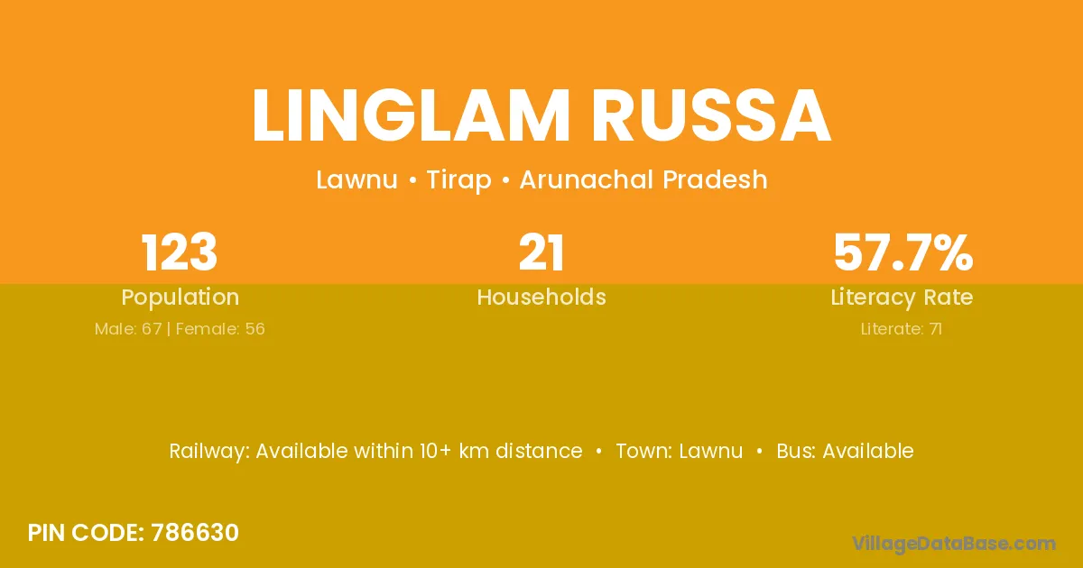 Linglam Russa village has a total population of 123 people, of which 67 are males and 56 are females.