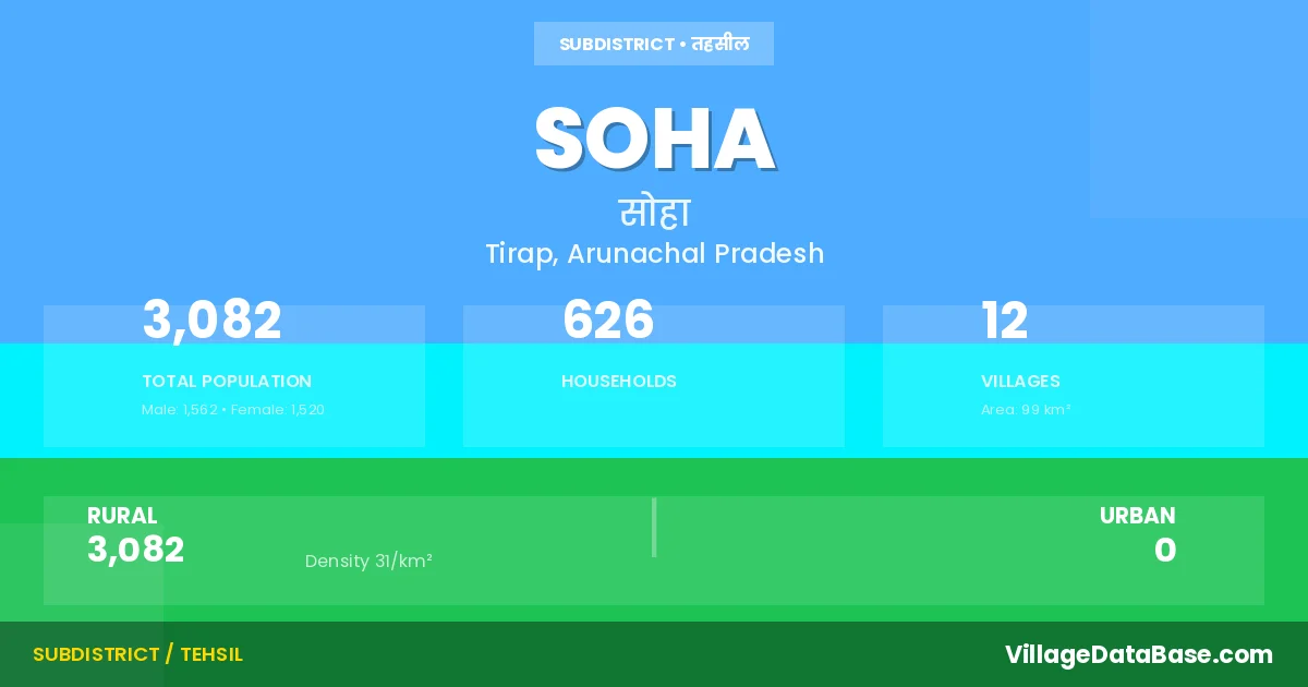 Soha is a town and Circle in the Tirap district of the Arunachal Pradesh. In India, a Circle is a subdivision of a district responsible for the administration and revenue collection of a specific area within the district. Circles play a crucial role in the local governance structure, contributing significantly to the development and administration of their communities.