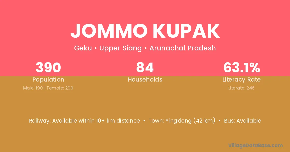 Yingkiong (42 km) is the nearest town to Jommo Kupak village for major economic activities and is located approximately 42 km away.