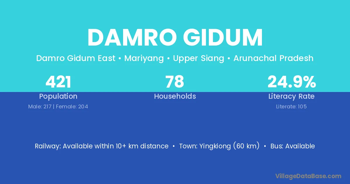Damro Gidum village has a total population of 421 people, of which 217 are males and 204 are females.