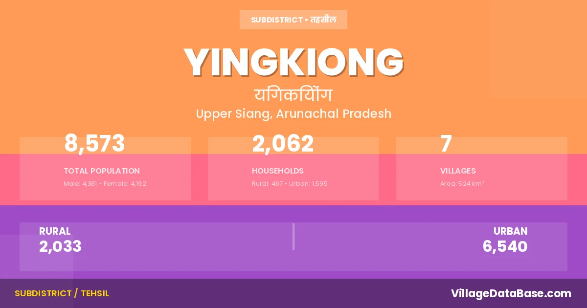 Yingkiong Circle comprises about 7 villages. Below is a list of these villages along with information about their respective gram panchayats and the nearest town: