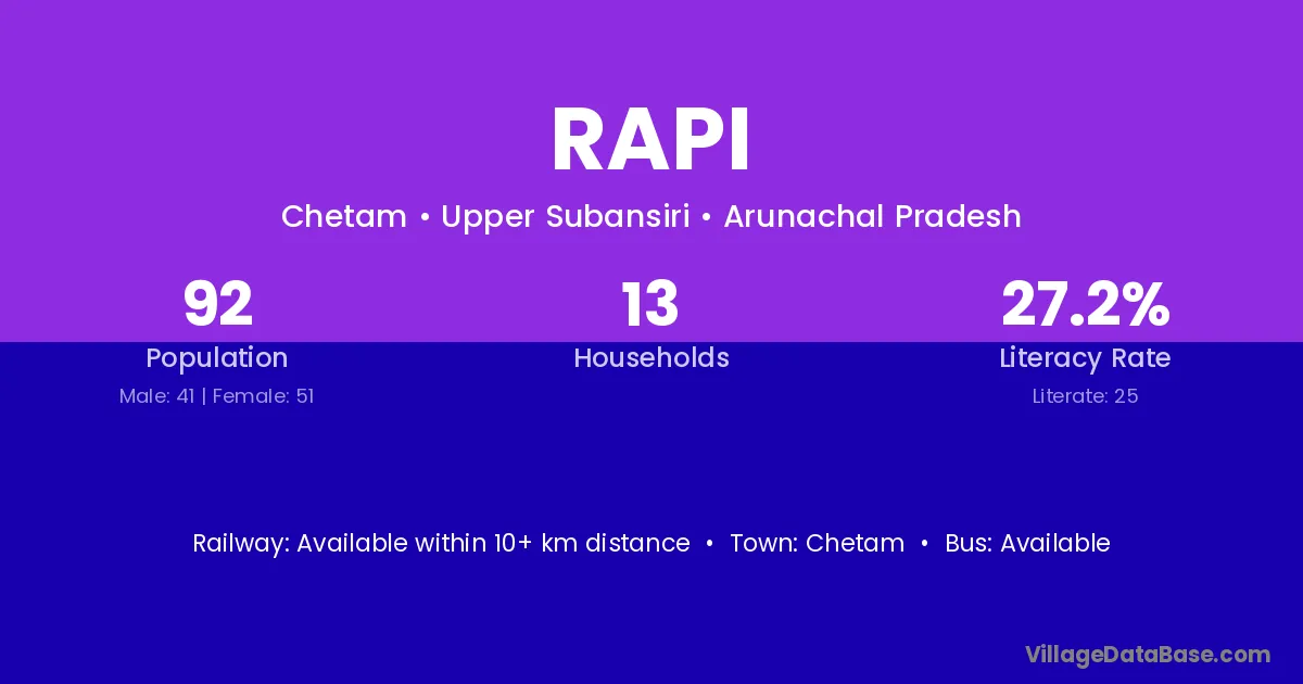 Rapi village has a total population of 92 people, of which 41 are males and 51 are females.