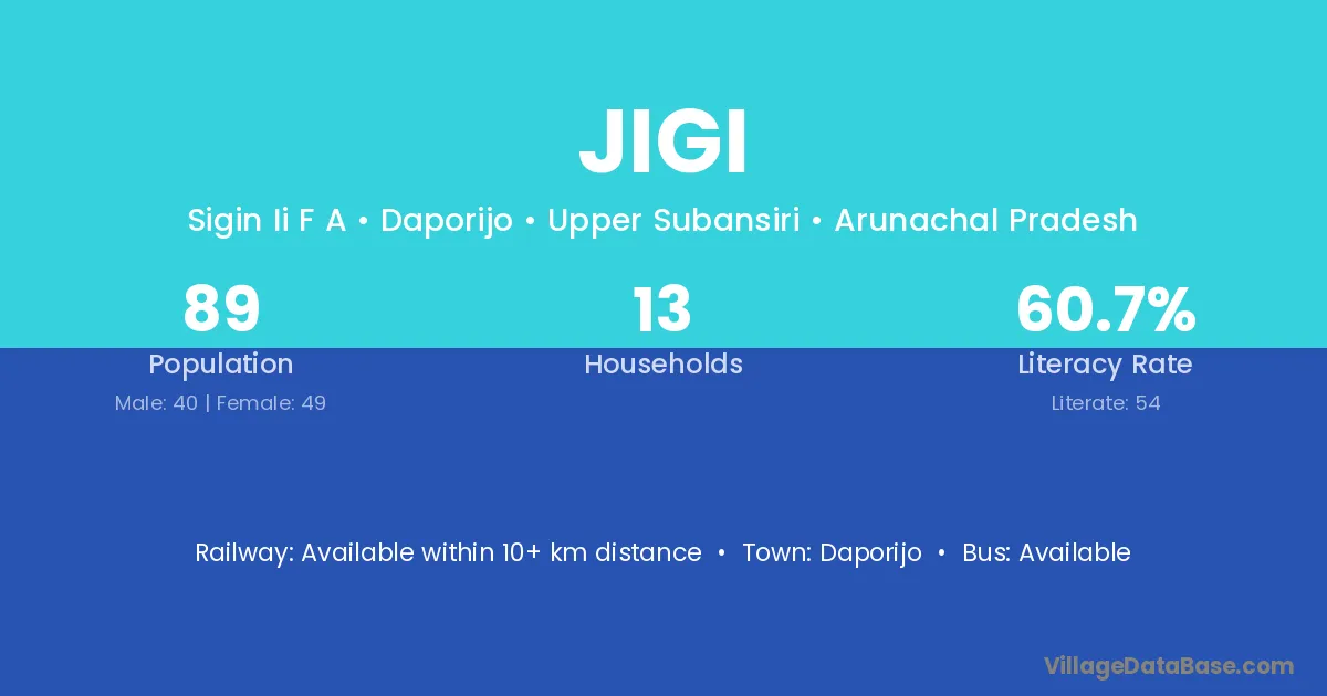 The literacy rate of Jigi village is 60.67%. Male literacy stands at 70.00% and female literacy at 53.06%.