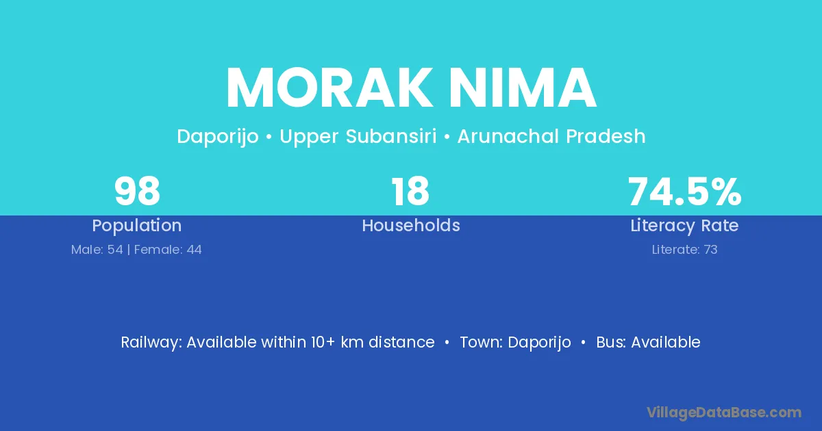 Morak Nima village has a total population of 98 people, of which 54 are males and 44 are females.