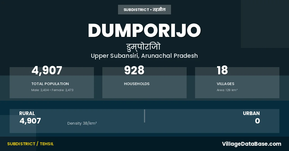 According to the 2011 census The total area of Dumporijo Circle is 129 km², with a population of 4907 people. The population density is 38 inhabitants per square kilometre, and there are approximately 928 houses in the sub district.