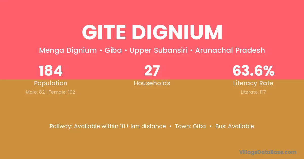 The literacy rate of Gite Dignium village is 63.59%. Male literacy stands at 65.85% and female literacy at 61.76%.