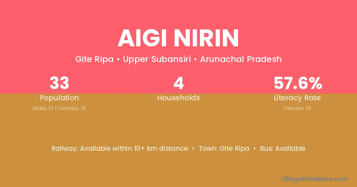 Aigi Nirin village has a total population of 33 people, of which 12 are males and 21 are females.
