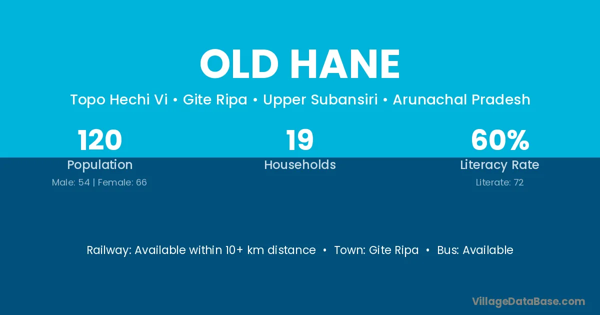 The literacy rate of Old Hane village is 60.00%. Male literacy stands at 68.52% and female literacy at 53.03%.
