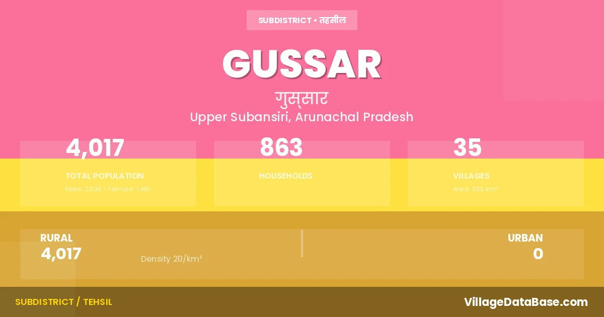 Gussar is a town and Circle in the Upper Subansiri district of the Arunachal Pradesh. In India, a Circle is a subdivision of a district responsible for the administration and revenue collection of a specific area within the district. Circles play a crucial role in the local governance structure, contributing significantly to the development and administration of their communities.