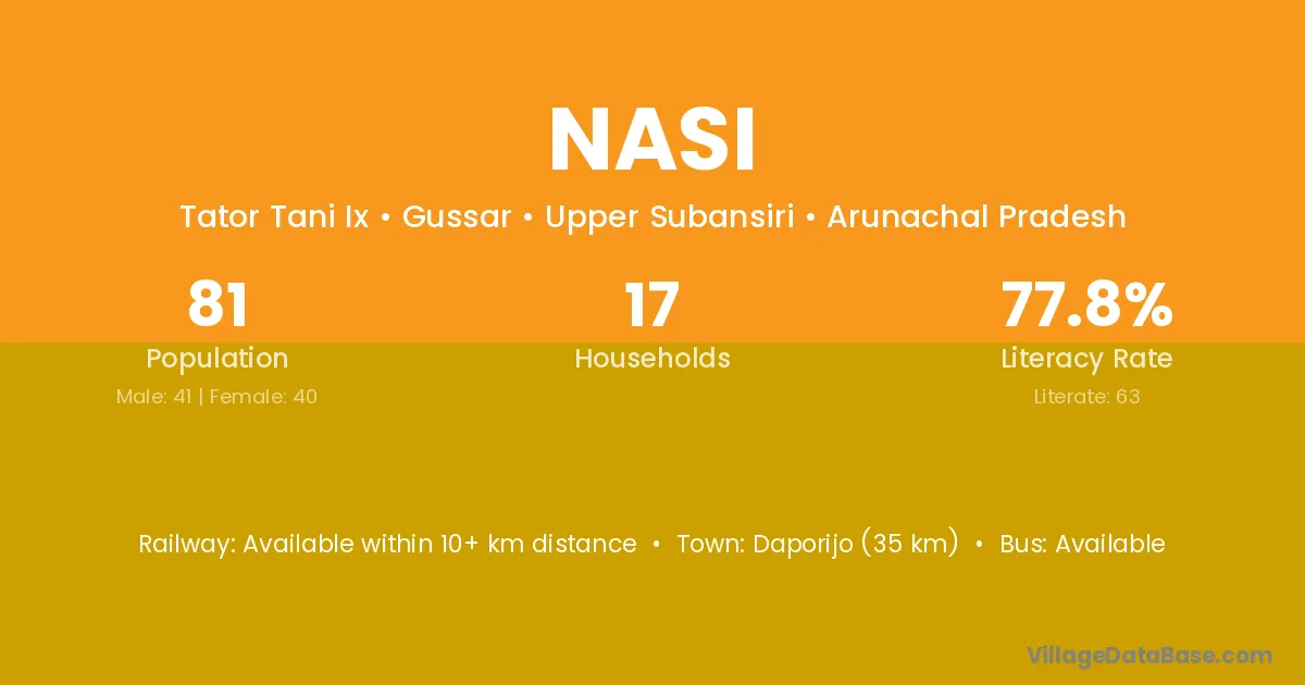 Daporijo (35 km) is the nearest town to Nasi village for major economic activities and is located approximately 35 km away.
