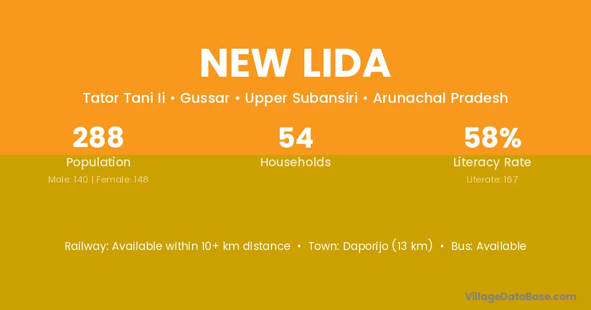 Daporijo (13 km) is the nearest town to New Lida village for major economic activities and is located approximately 13 km away.