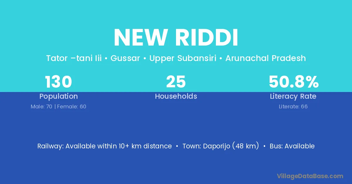 Daporijo (48 km) is the nearest town to New Riddi village for major economic activities and is located approximately 48 km away.