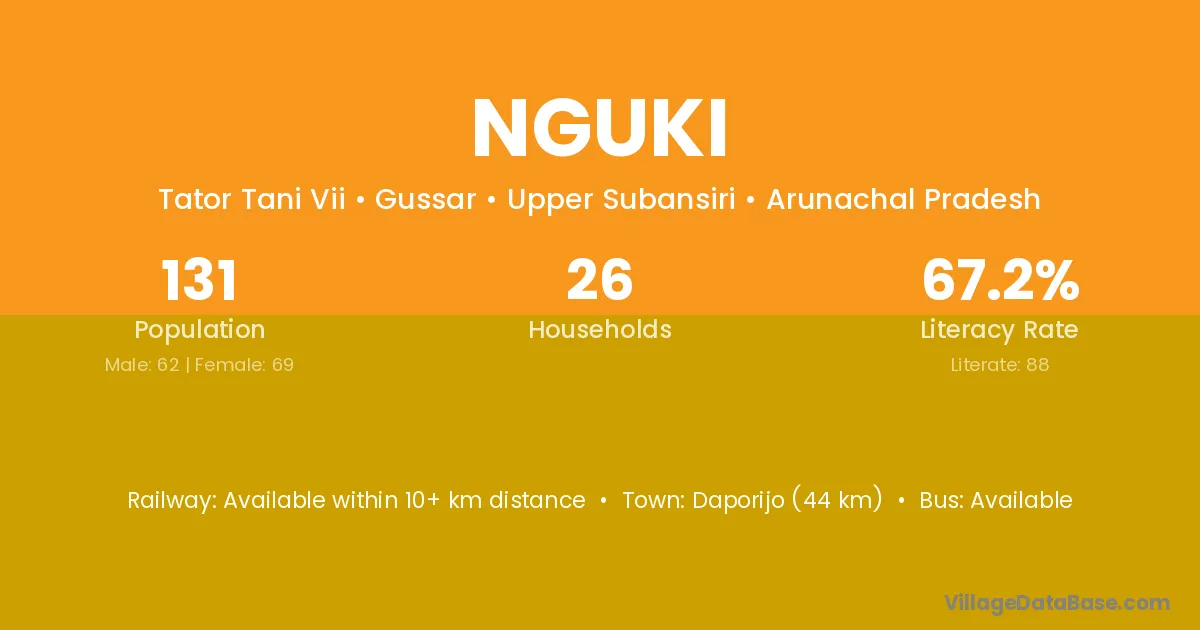 Daporijo (44 km) is the nearest town to Nguki village for major economic activities and is located approximately 44 km away.