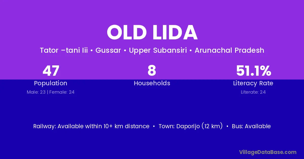 Daporijo (12 km) is the nearest town to Old Lida village for major economic activities and is located approximately 12 km away.