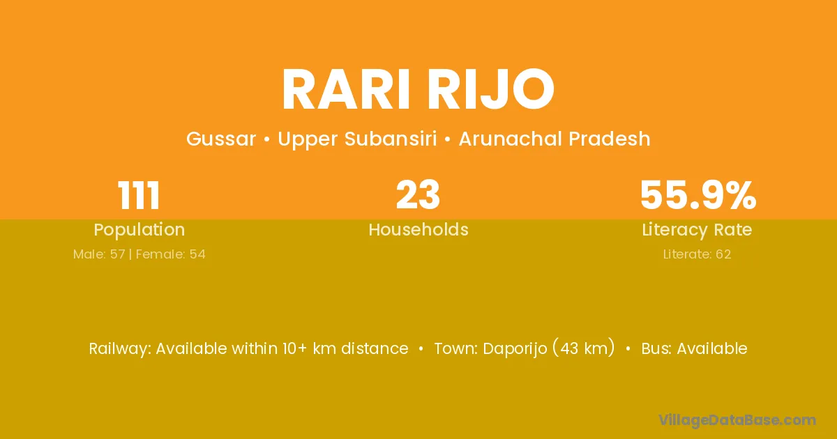 Daporijo (43 km) is the nearest town to Rari Rijo village for major economic activities and is located approximately 43 km away.