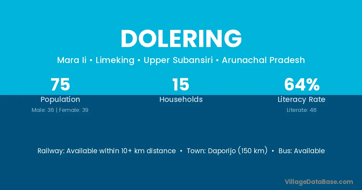 Daporijo (150 km) is the nearest town to Dolering village for major economic activities and is located approximately 150 km away.