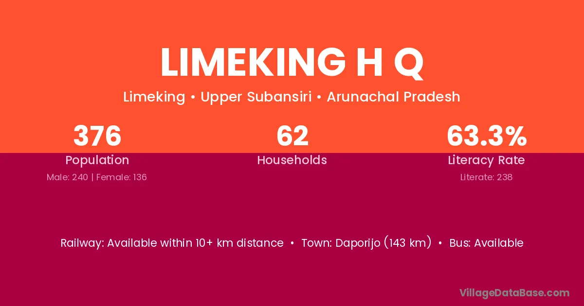 The literacy rate of Limeking H Q village is 63.30%. Male literacy stands at 69.58% and female literacy at 52.21%.