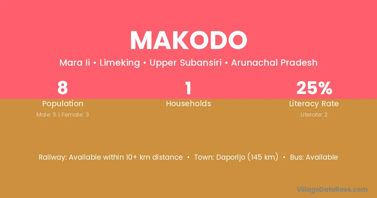 Daporijo (145 km) is the nearest town to Makodo village for major economic activities and is located approximately 145 km away.