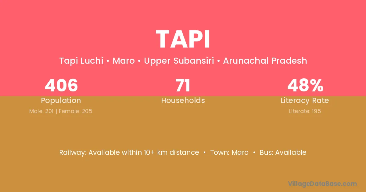Tapi village has a total population of 406 people, of which 201 are males and 205 are females.