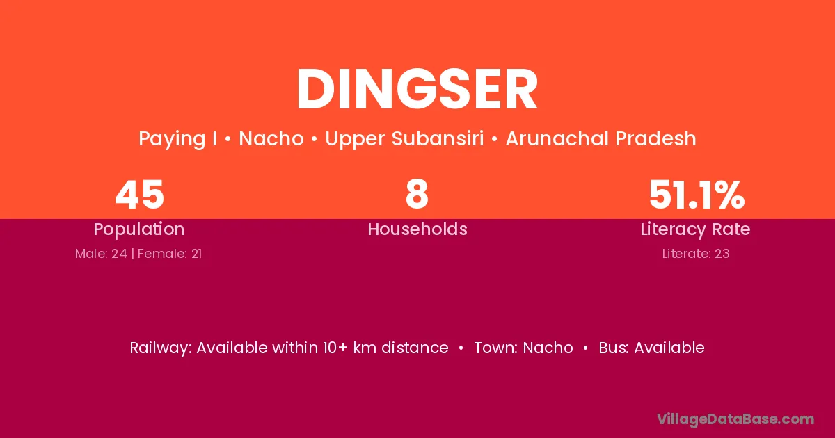 Dingser village has a total population of 45 people, of which 24 are males and 21 are females.