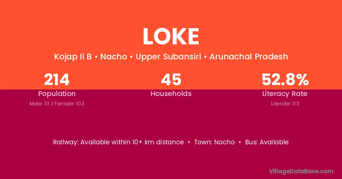 Loke village has a total population of 214 people, of which 111 are males and 103 are females.