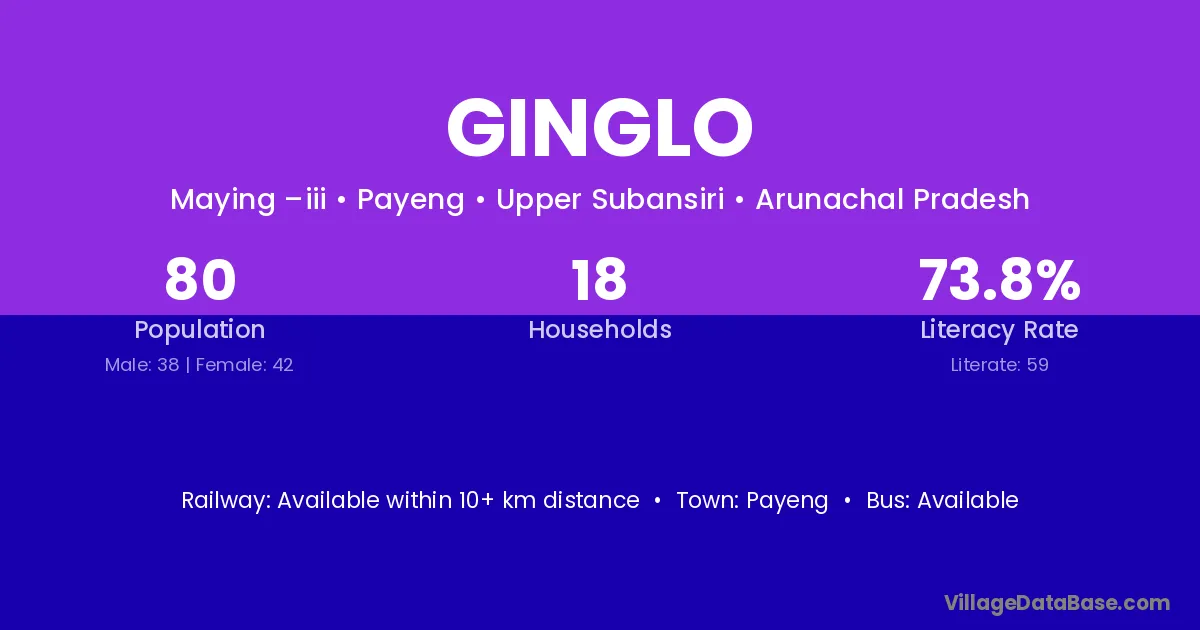The literacy rate of Ginglo village is 73.75%. Male literacy stands at 81.58% and female literacy at 66.67%.
