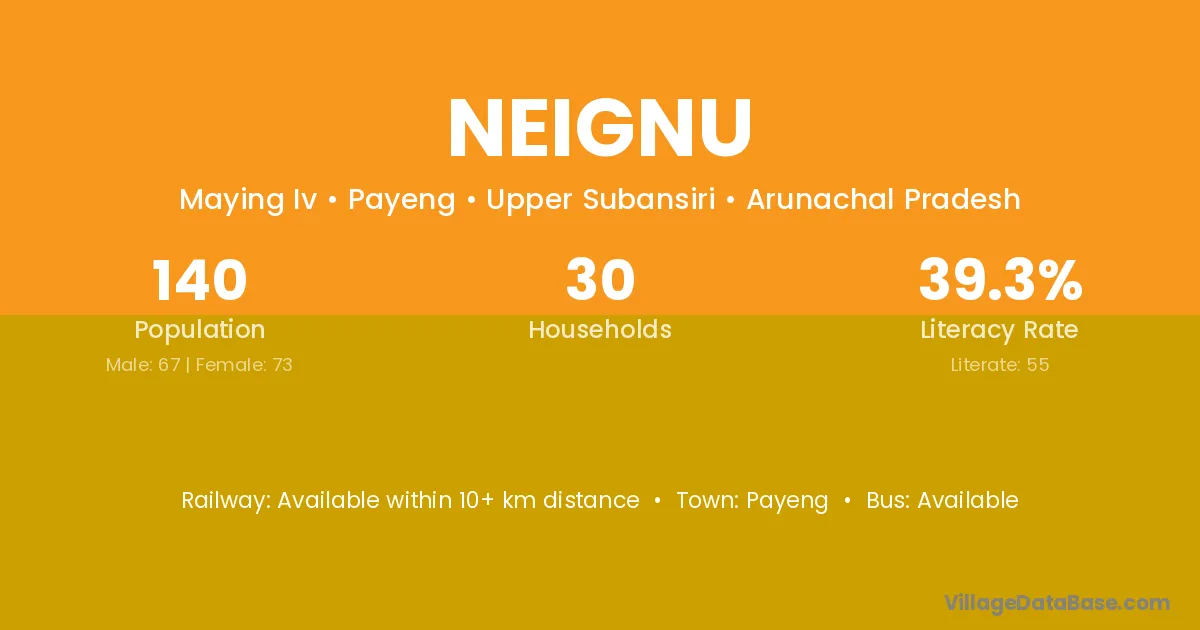 Neignu village has a total population of 140 people, of which 67 are males and 73 are females.