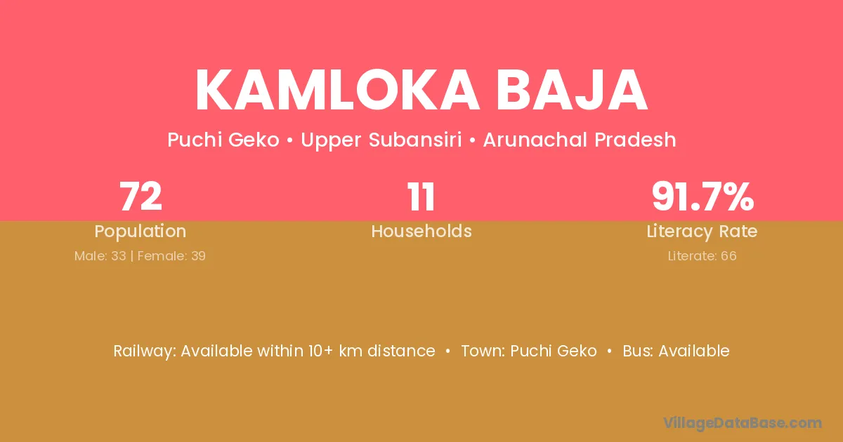 Kamloka Baja village has a total population of 72 people, of which 33 are males and 39 are females.