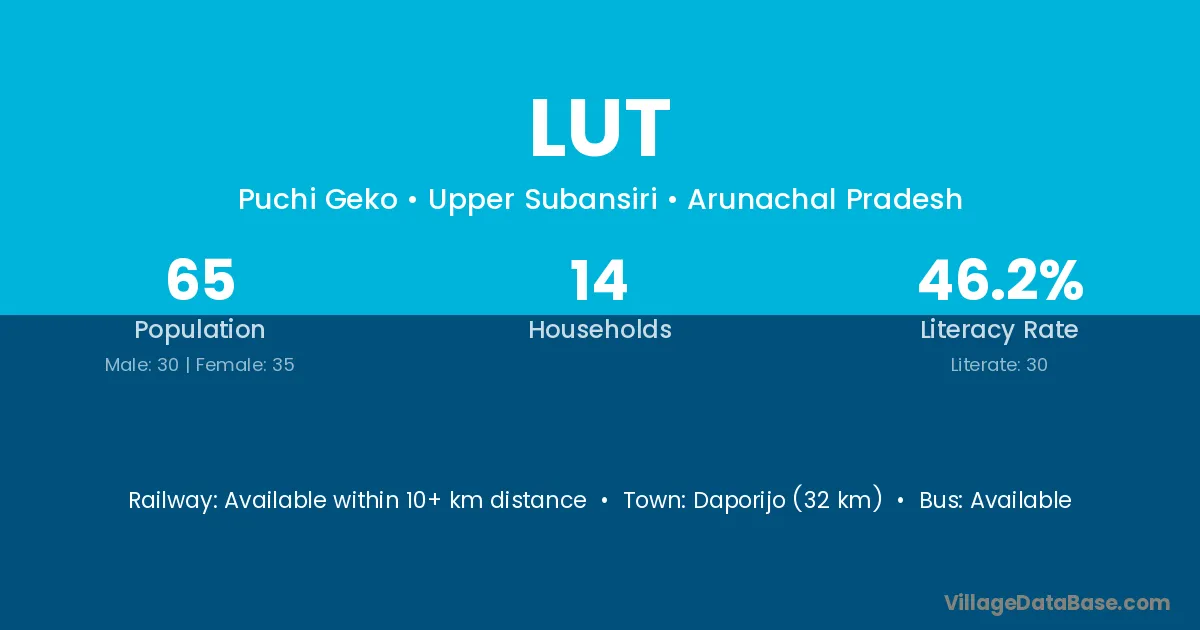 Daporijo (32 km) is the nearest town to Lut village for major economic activities and is located approximately 32 km away.