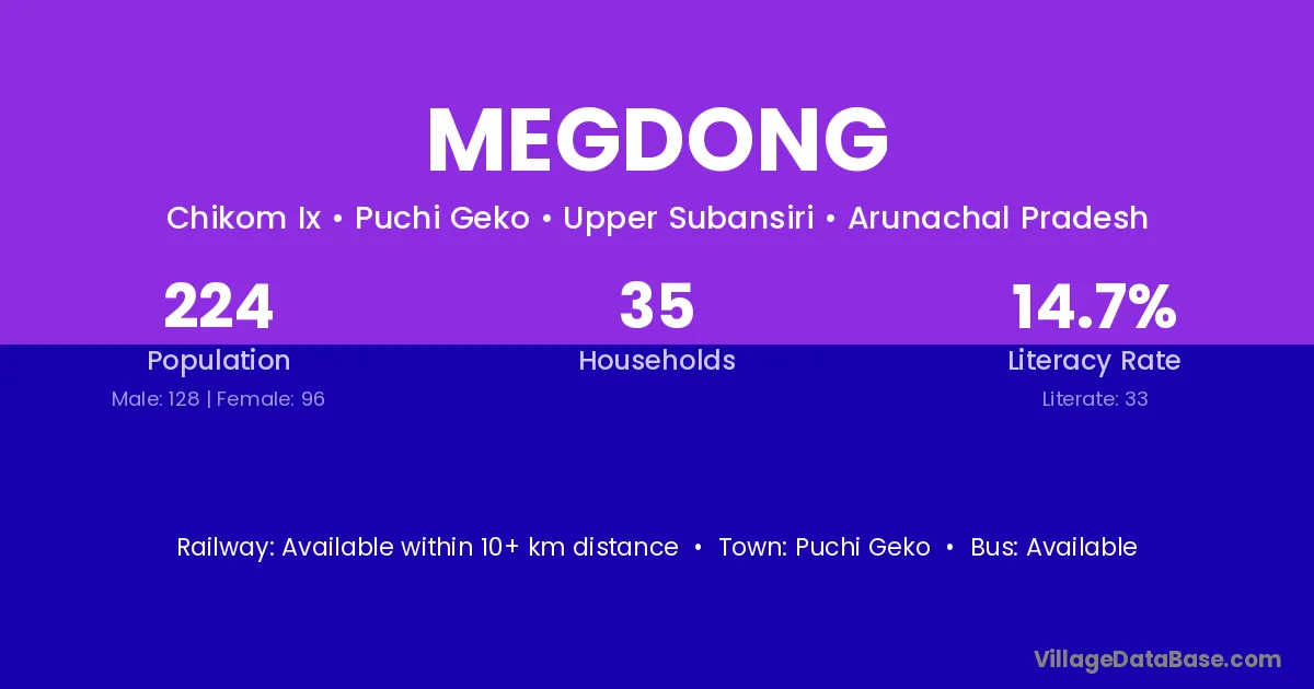 Megdong village has a total population of 224 people, of which 128 are males and 96 are females.