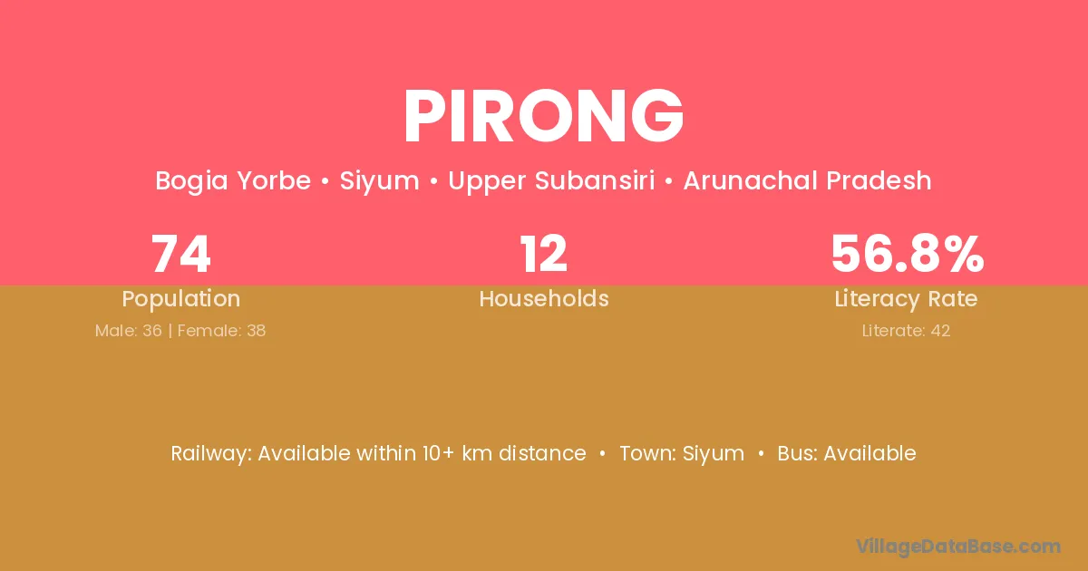 Pirong village has a total population of 74 people, of which 36 are males and 38 are females.